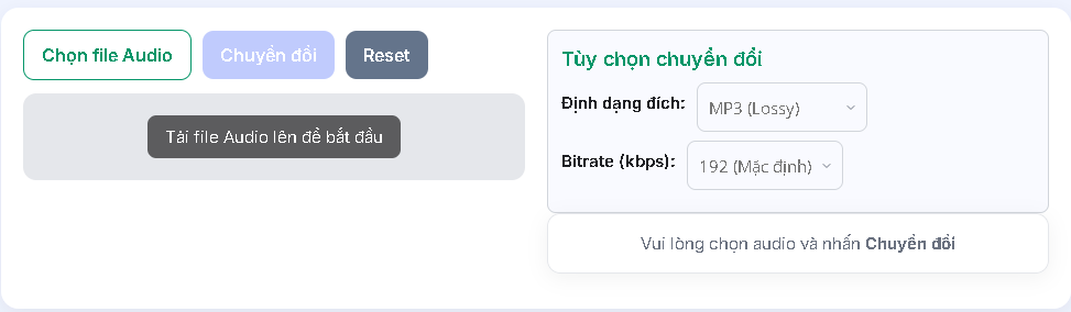 - Nhấn “Chọn file Audio” để tải lên tệp âm thanh từ thiết bị.