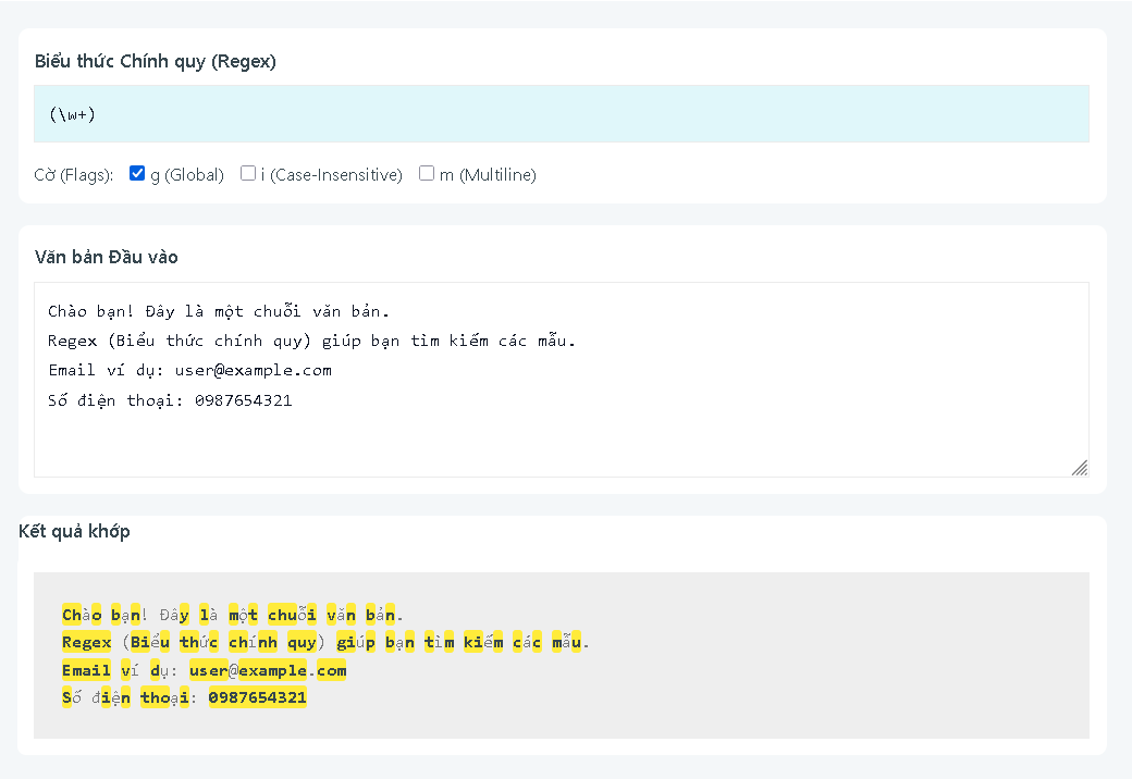 - Nhập biểu thức Regex và đoạn văn bản mẫu → xem kết quả khớp ngay tức thì.